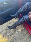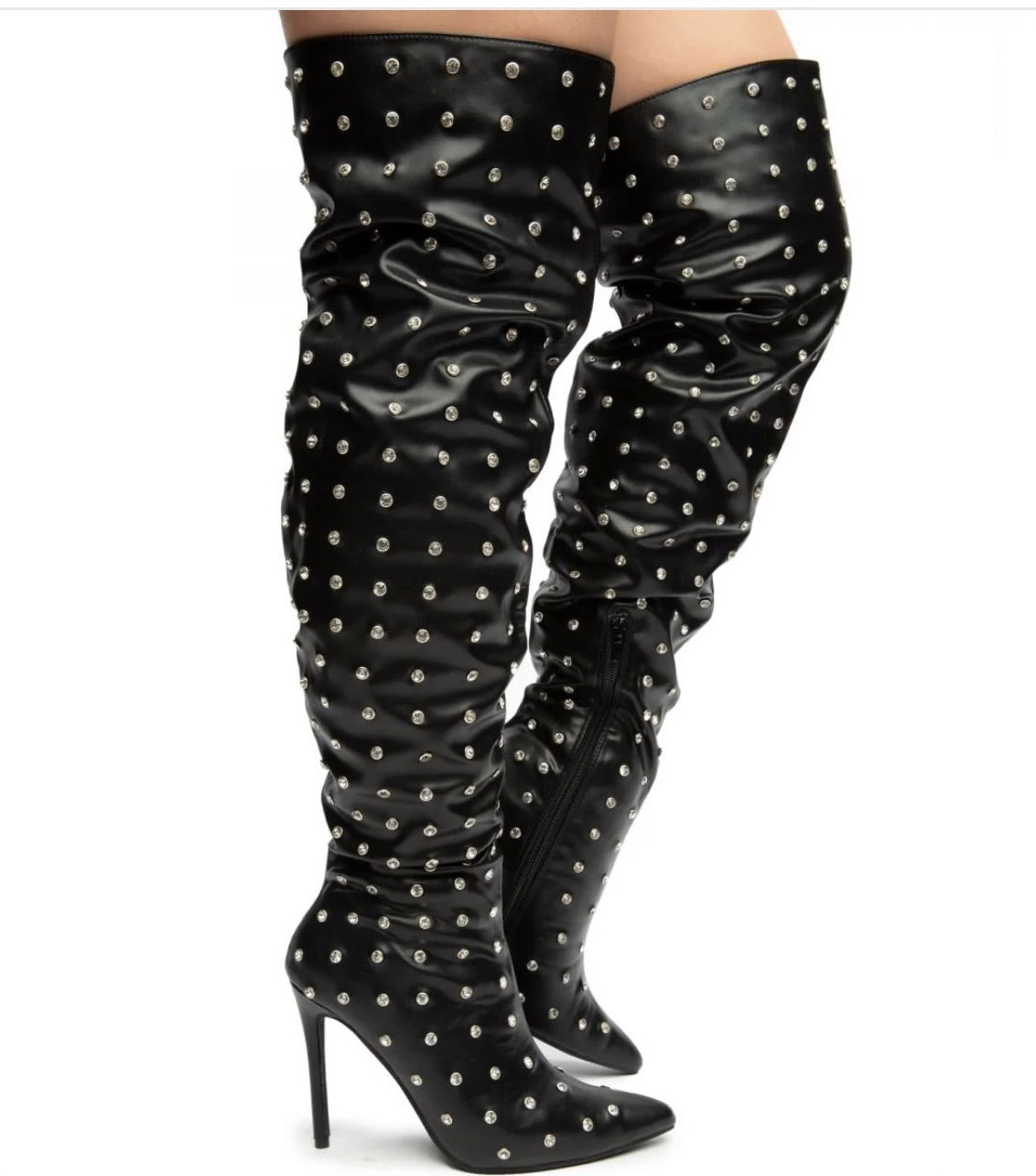 Turn heads all season long in these fierce black thigh-high stiletto boots! Crafted from sleek faux leather and detailed with silver studs all over, these boots serve attitude, confidence, and pure glam in every step. The pointed toe and slim stiletto heel add that extra boss babe energy, making them perfect for nights out, photo ops, or your next statement look.